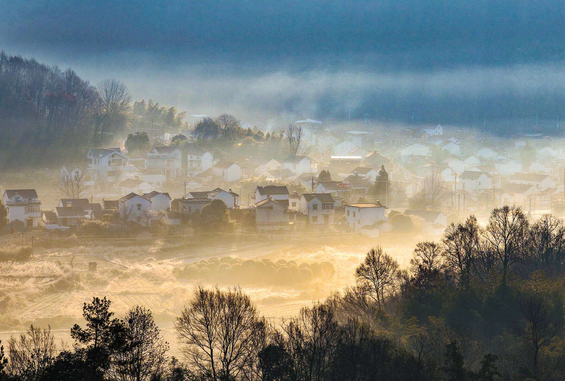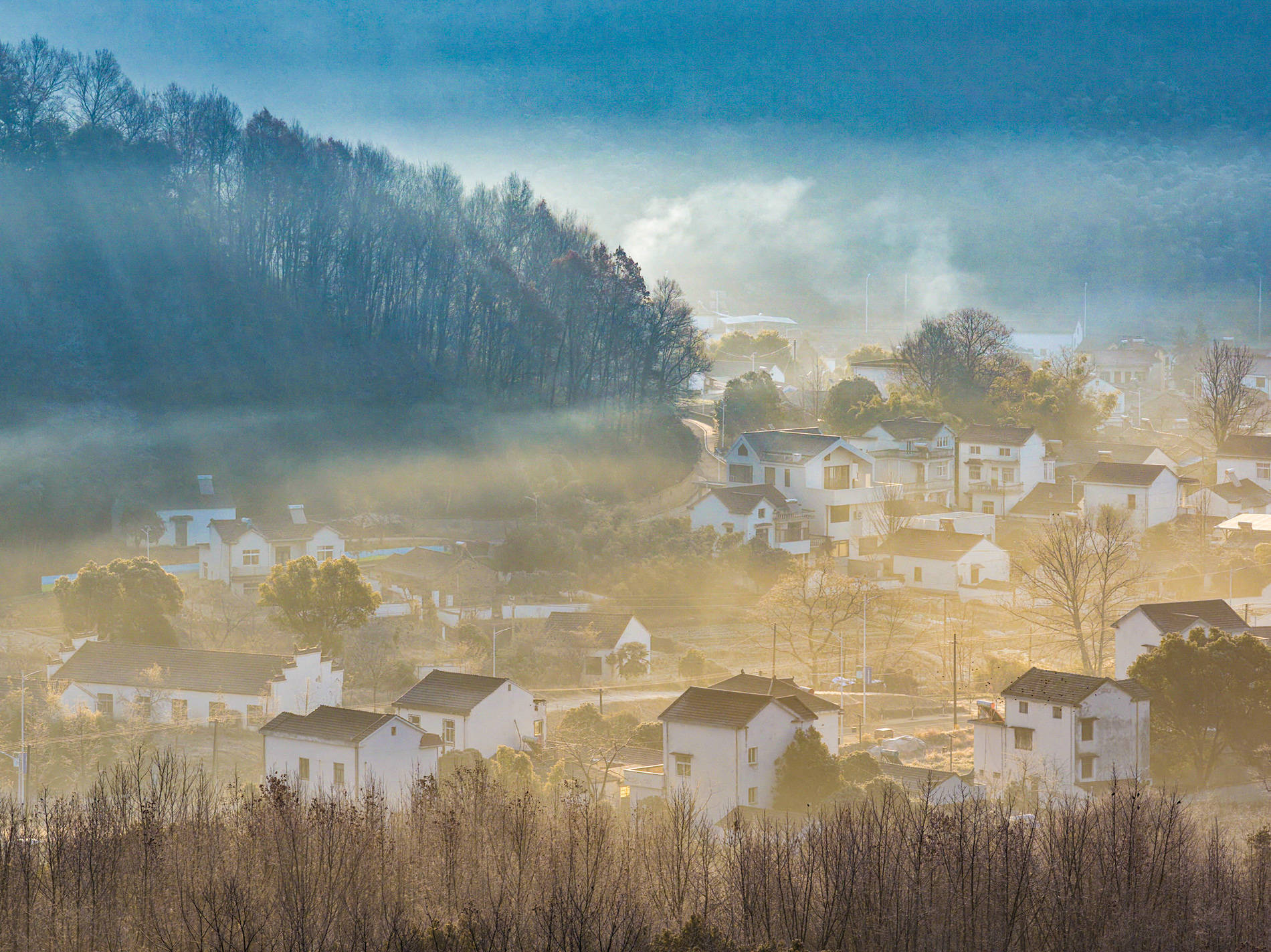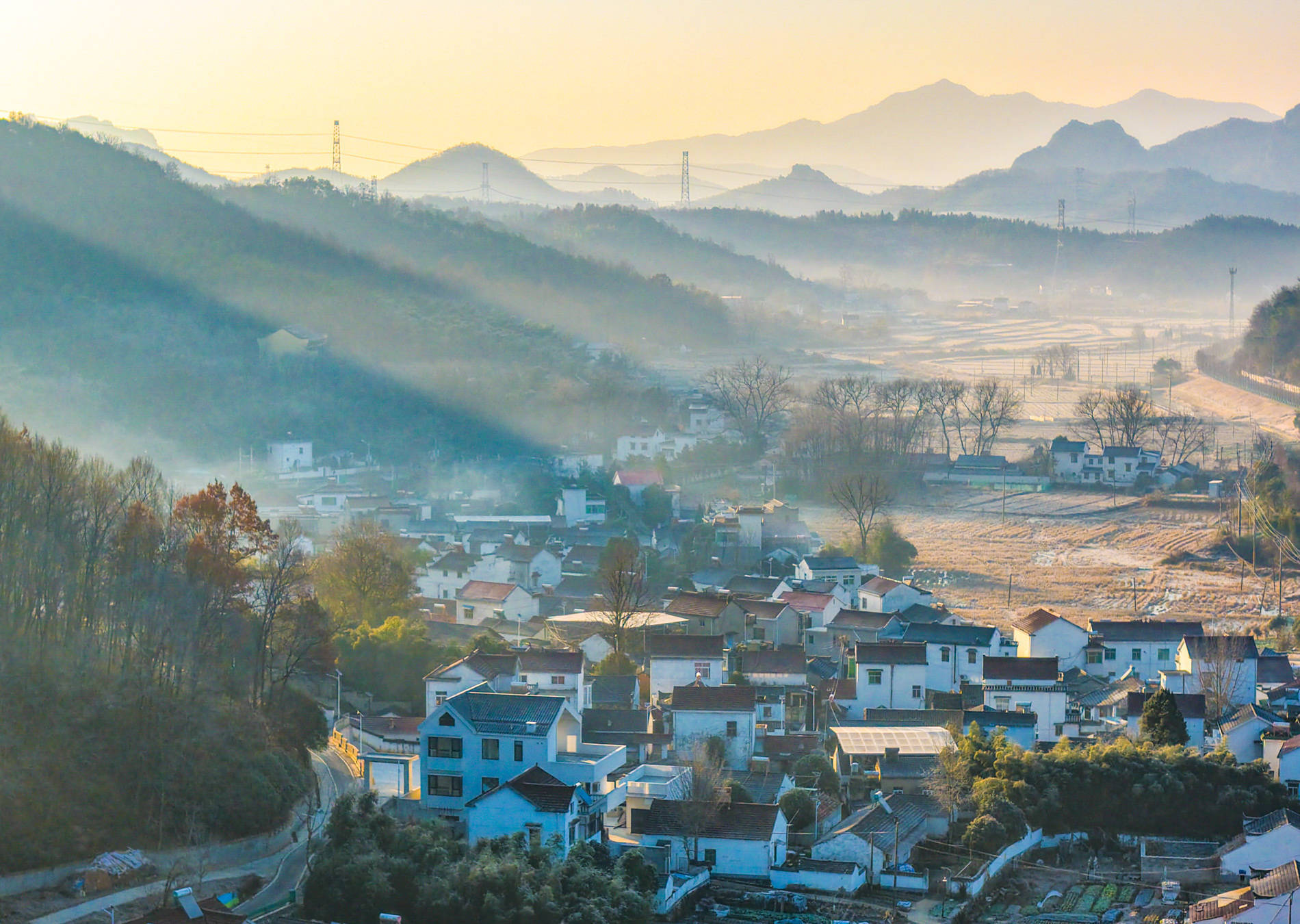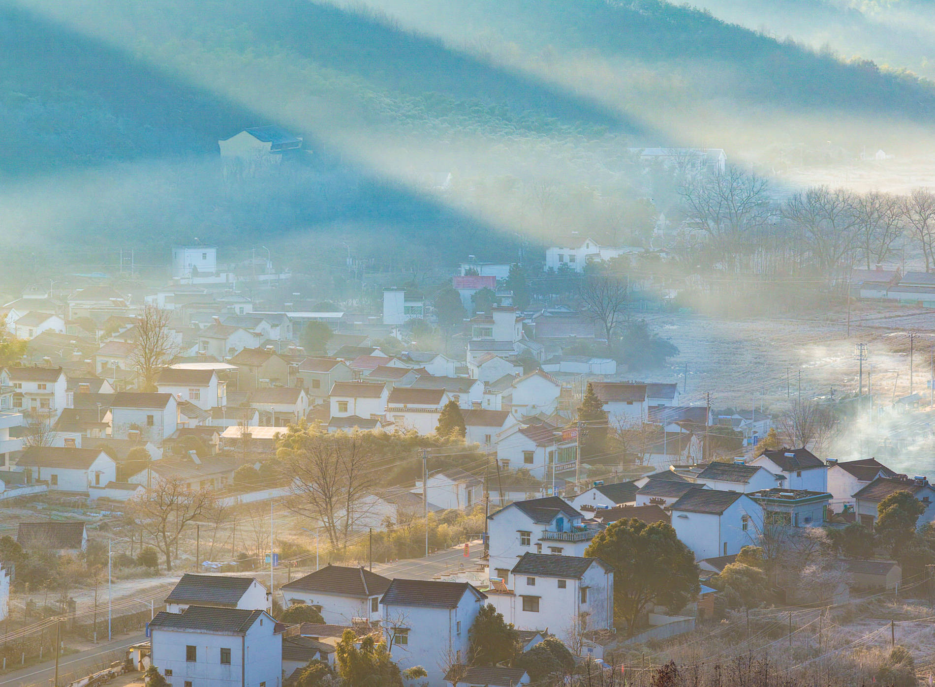 2026年1月7日,在安徽省芜湖市繁昌区孙村镇中分村,晨雾中错落有致的民居与田野、道路、山峦相映成景,呈现出一幅秀美的冬日生态画卷。
