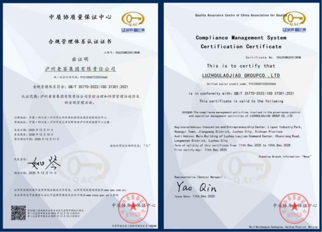 12月11日,泸州老窖(000568)集团成功获得由中质协质量保证中心颁发的GB/T35770-2022及ISO37301:2021《合规管理体系认证证书》。